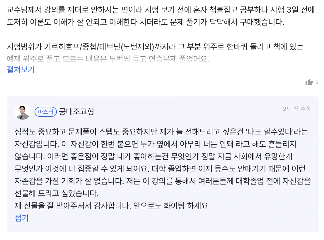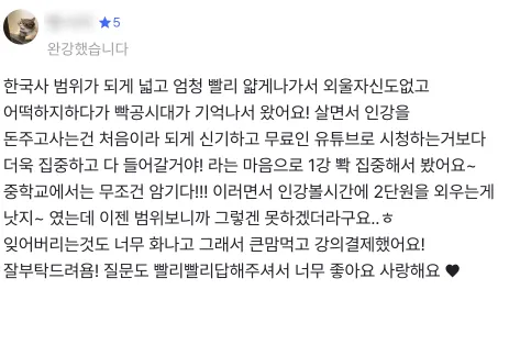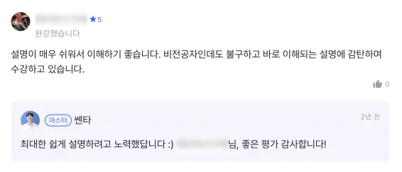 풍부한 내용의 최신 수강평을 3개 이상 쌓게 되면 수강을 고민하고 있는 예비 수강생들에게 긍정적인 영항을 미치게 됩니다.